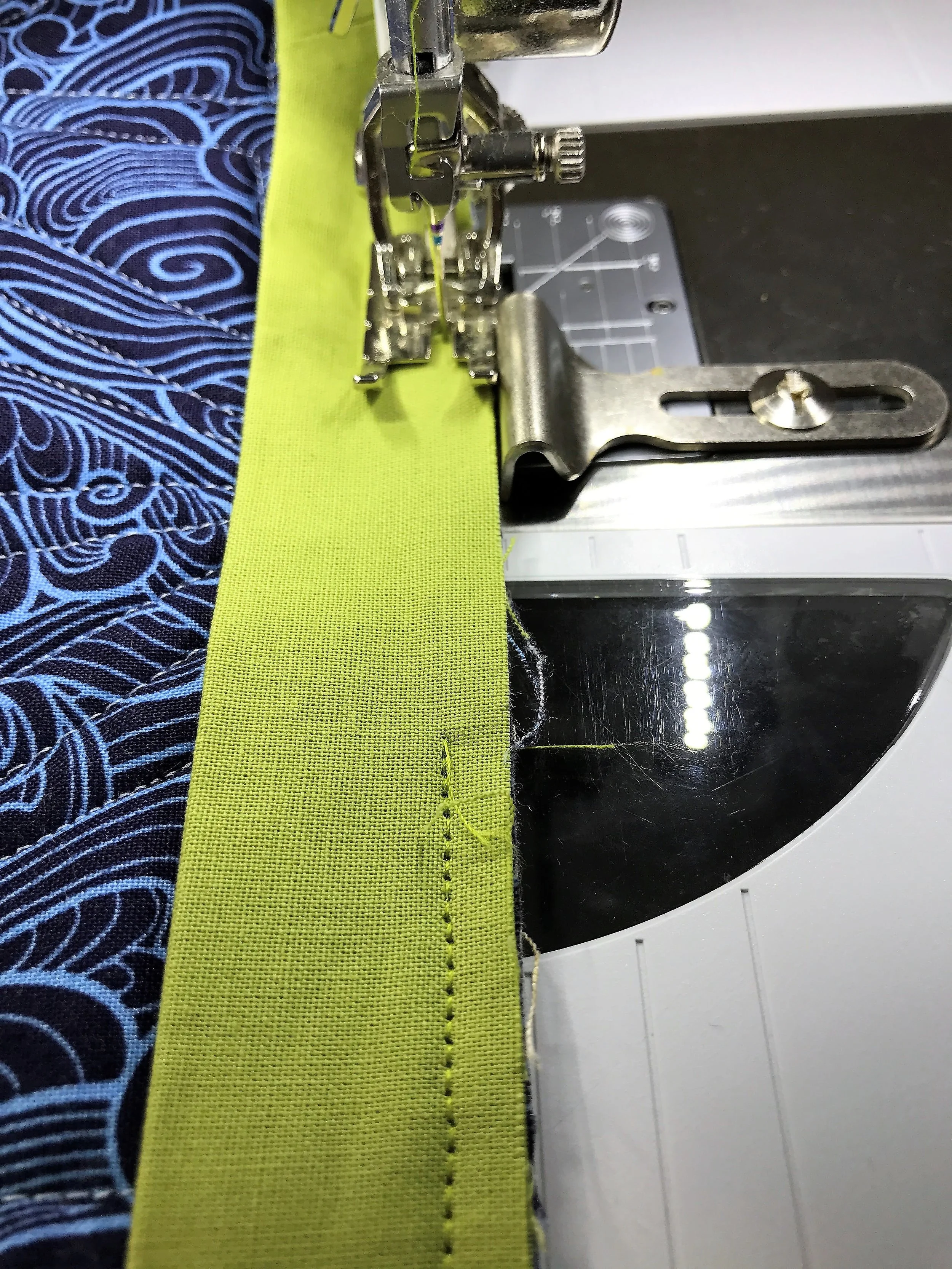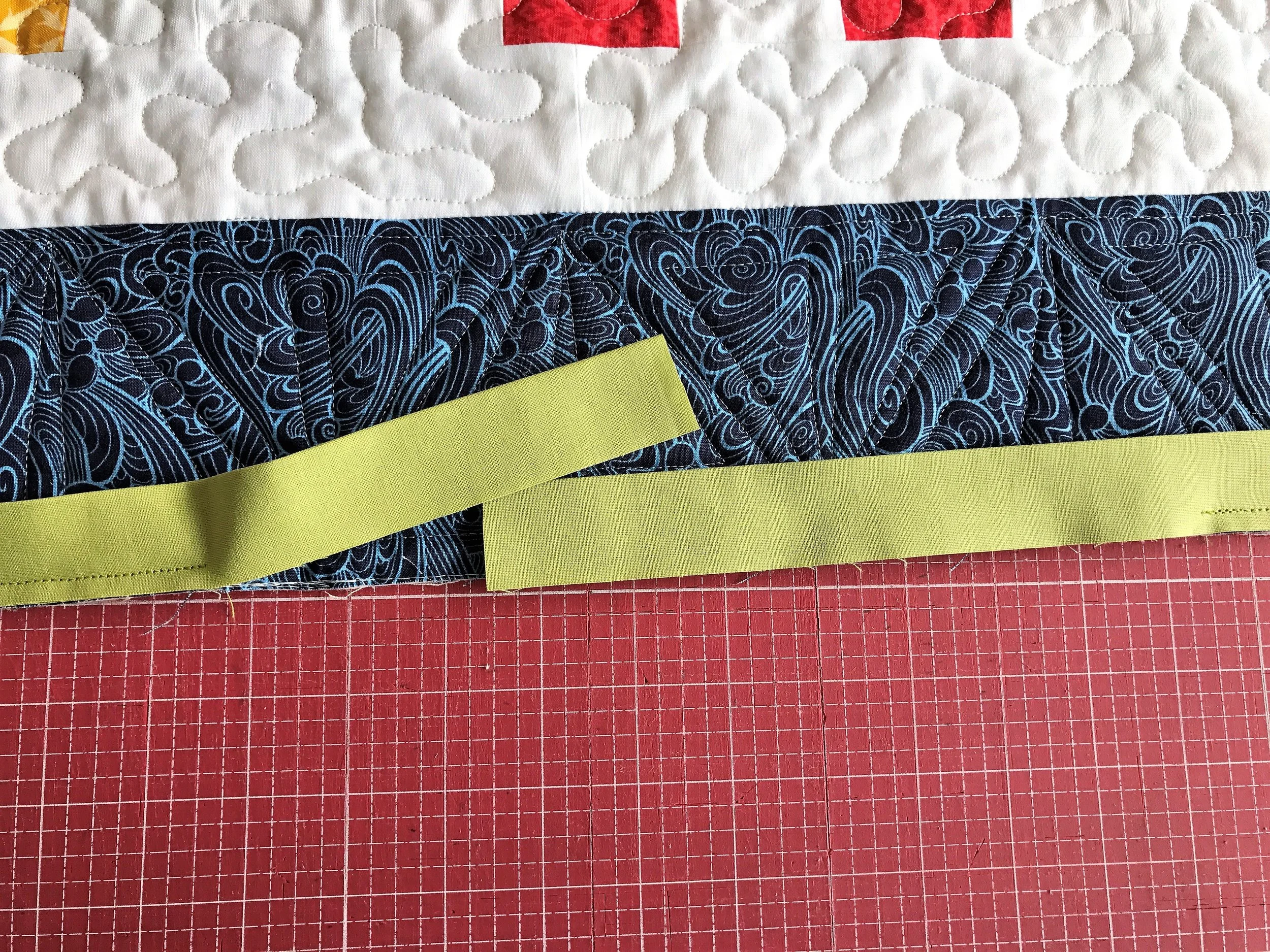 Diese müsst ihr nun so kürzen, dass sie etwa in der Mitte eurer Lücke überlappen. Und hier kommt nun der wichtigste Kniff, der bewirkt, dass das Binding danach genau die richtige Länge hat: die Überlappungs-Länge. Diese berechnet sich so: die Breite eures Bindings + 0,25''. Mein Binding ist beispielsweise 2,25'' breit, daher beträgt meine Überlappungs-Länge 2,5''.