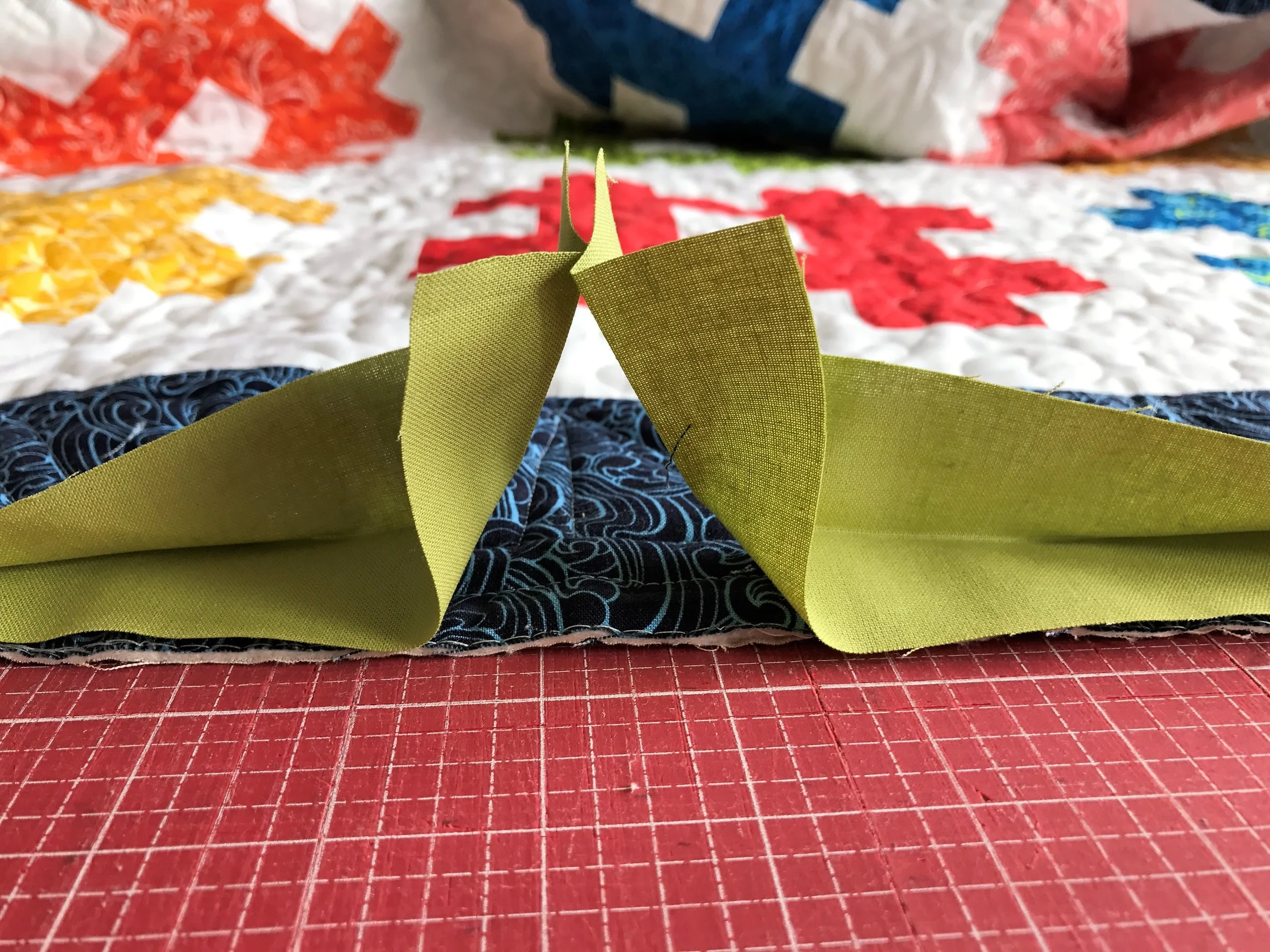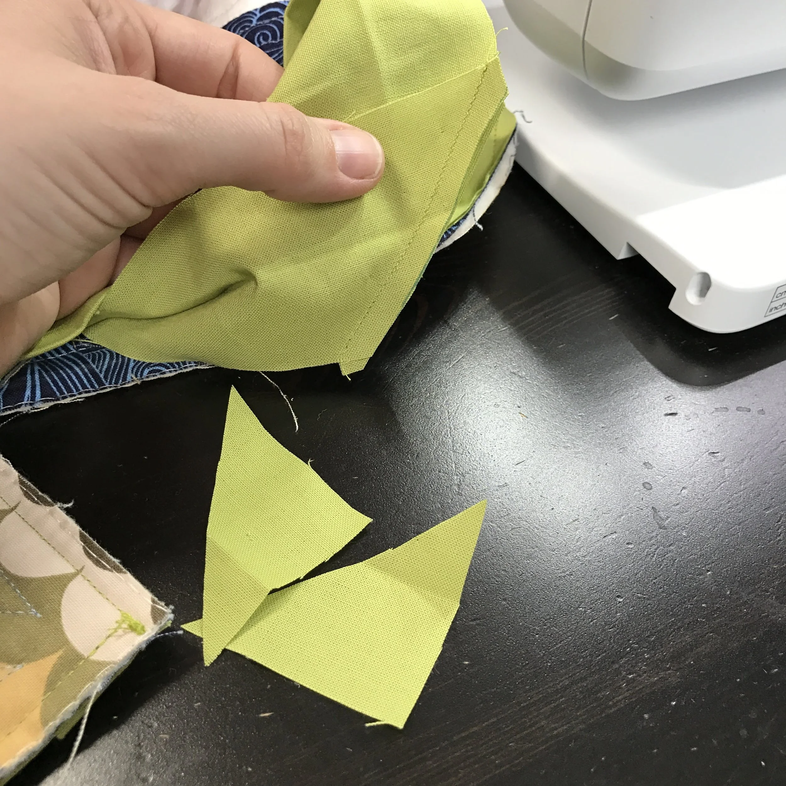 Bevor als nächstes die Nahtzugaben geschnitten werden, prüft sicherheitshalber nach, dass ihr die richtigen Diagonale genäht habt. Sonst könnte es ein sehr trauriger Tag werden...