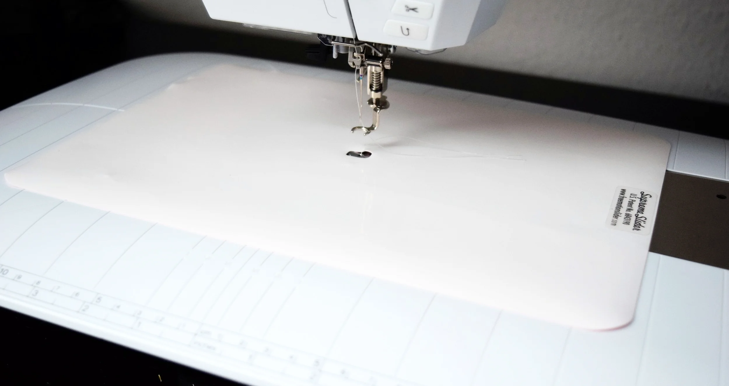 Der Supreme Slider ist eine Matte aus Silikon. Die Oberseite ist weiß und glatt. Dadurch gleitet der Quilt leichter und man benötigt weniger Kraft, um ihn zu schieben. Die Unterseite des Supreme Slieders ist rosa und klebrig und haftet dadurch optimal auf dem Anschiebetisch.