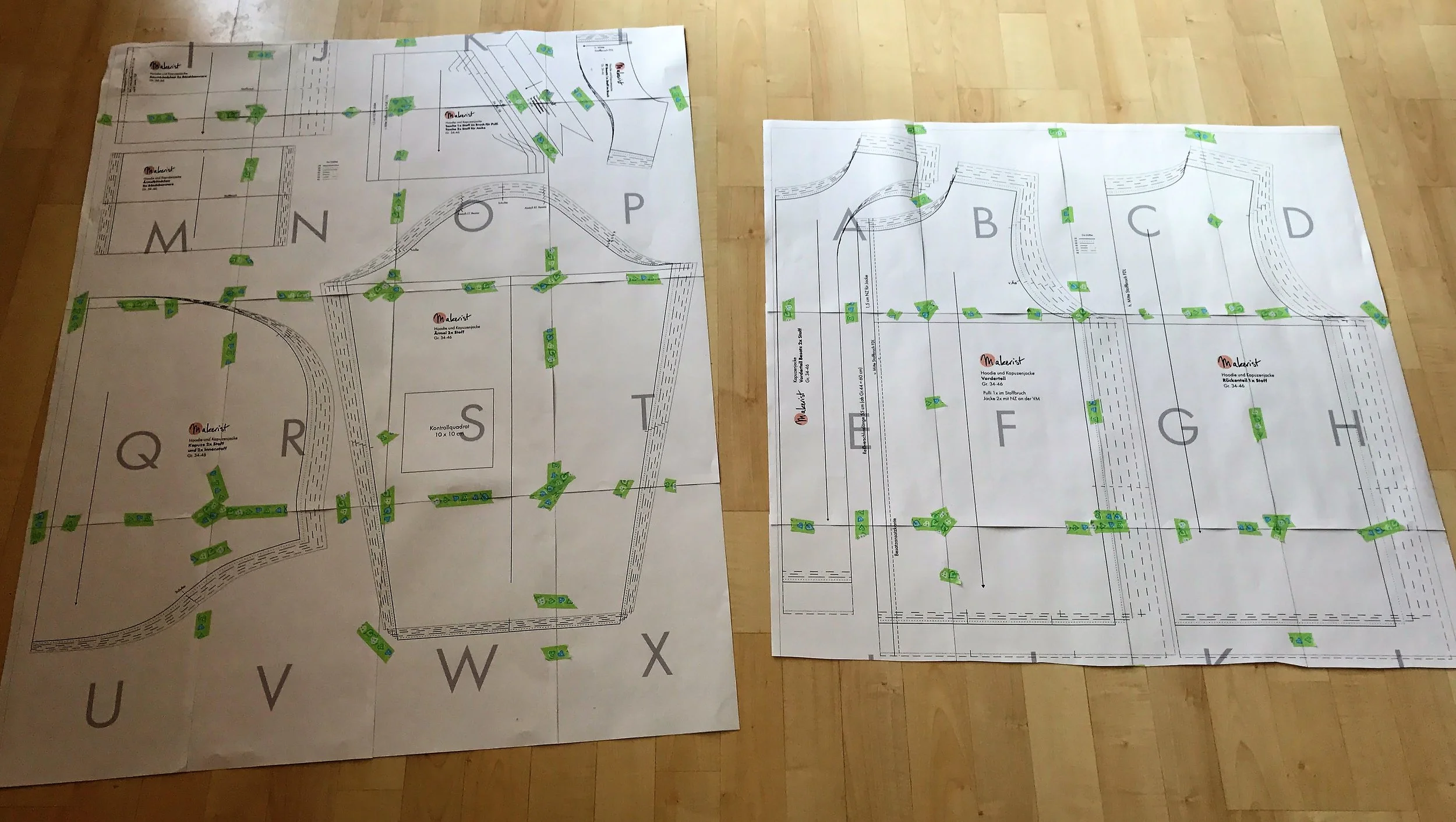 Ich verwende dazu immer am liebsten einen Rollschneider, weil man damit einfach schneller und genauer schneiden kann als mit einer Schere, und Masking-Tape, weil es sich einfach wieder ablösen lässt ohne dabei das Papier zu zerreißen, wenn man sich mal verklebt hat. An dieses Stelle muss ich das Team von Makerist und Katja Bercher sehr loben: Ich habe schon oft mit PDF-Schnittmustern gearbeitet und bis zu diesem Zeitpunkt meistens Probleme gehabt, diese richtig zusammenzufügen, da die Linien nie absolut übereingestimmt haben. Bei diesem PDF waren alle Linien an der richtigen Stelle und so war das Schnittmuster vergleichsweise schnell zusammengesetzt.