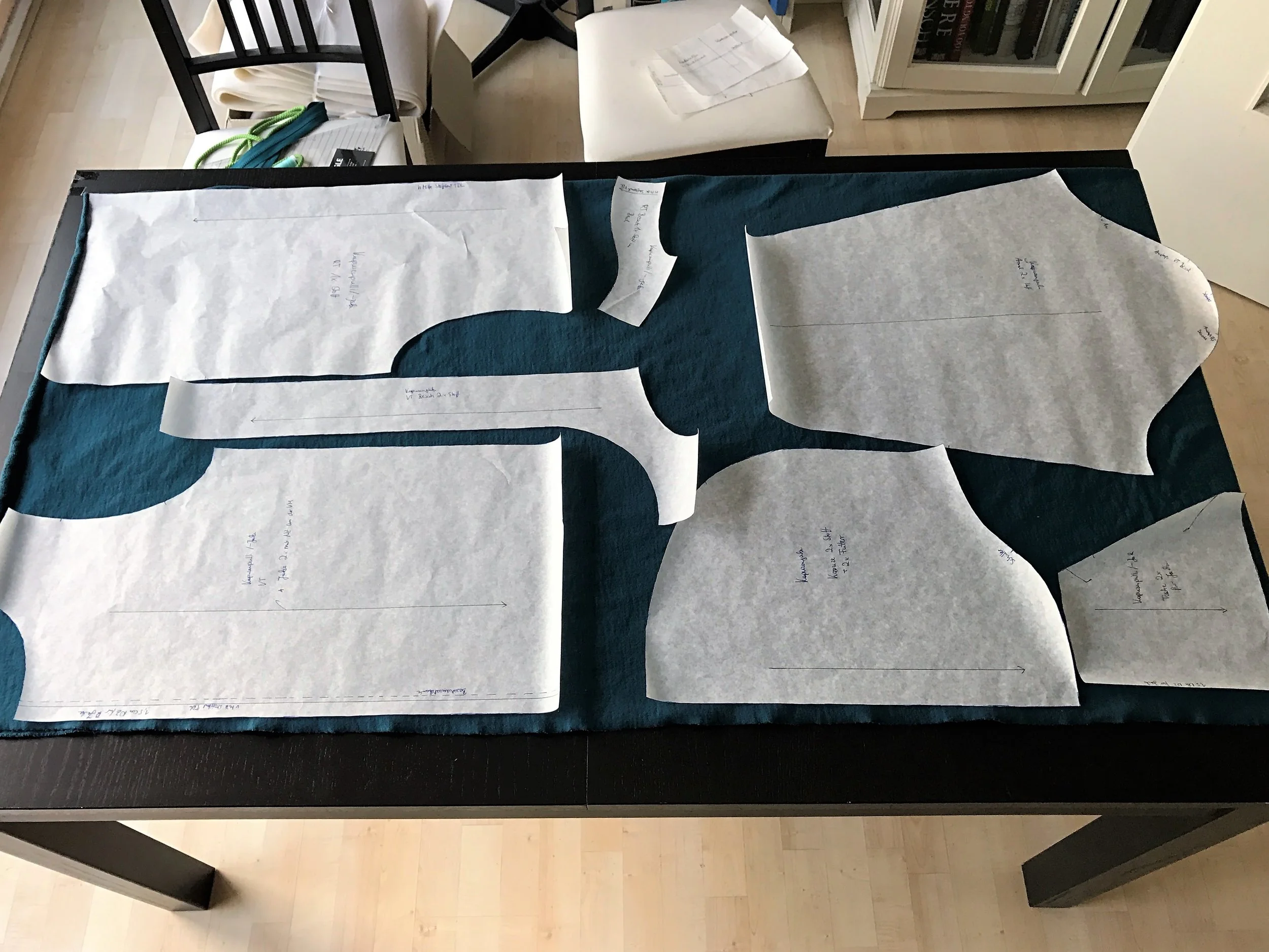 Nachdem ich alle Teile für meine Größe abgepaust und ausgeschnitten hatte, konnte ich dann endlich mit dem Zuschnitt beginnen. Dabei ist mir aufgefallen, dass die benötigte Stoffmenge für den Oberstoff in der Anleitung doch recht knapp bemessen ist. Zum Glück hatte ich etwas mehr gekauft. Trotzdem hat es gerade so gereicht und ich musste vorher genau ausprobieren, welches Schnittteil ich an welche Stelle lege. Wenn ihr also einen Stoff mit direktionalem Muster verwendet, achtet darauf, dass ihr eventuell sogar die doppelte Menge an Stoff kauft, damit dieser euch nicht mittendrin ausgeht.