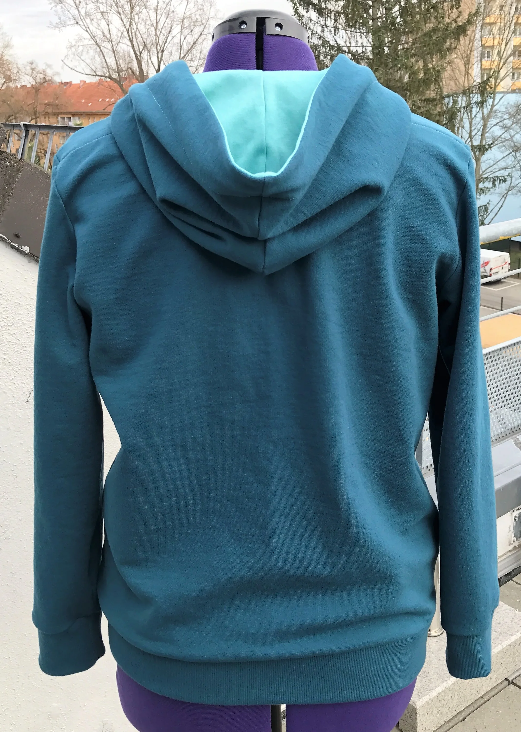 Meiner Meinung nach ist es kein Kurs für Nähanfänger. Man sollte schon etwas Erfahrung, vor allem mit der Verarbeitung von Jersey oder anderen elastischen Stoffen, mitbringen. Auch für absolute Overlock-Neulinge ist der Kurs nicht geeignet, da er grundlegende Kenntnisse im Umgang mit einer solchen Maschine voraussetzt. Dennoch können beide Projekte auch an einer normalen Haushaltsmaschine genäht werde. Ich für meinen Teil fühle mich nach diesem Kurs relativ sicher, was das Nähen eines Hoodies oder einer Kapuzenjacke angeht und habe auch schon einen Hoodie für meinen Mann in Planung.