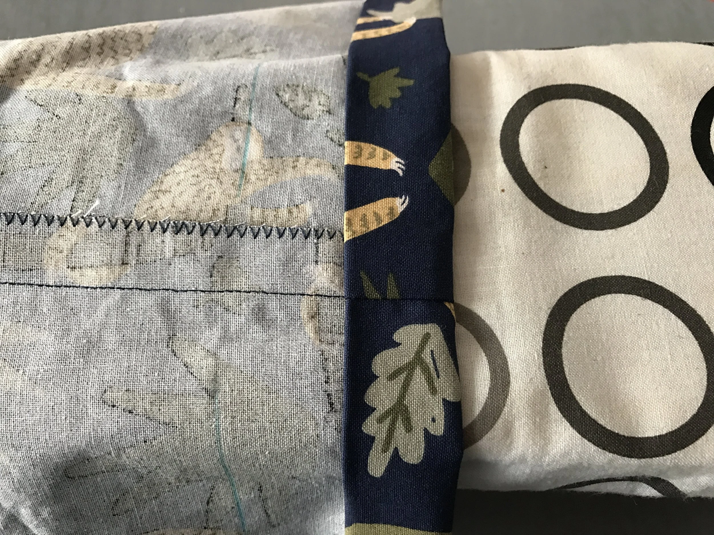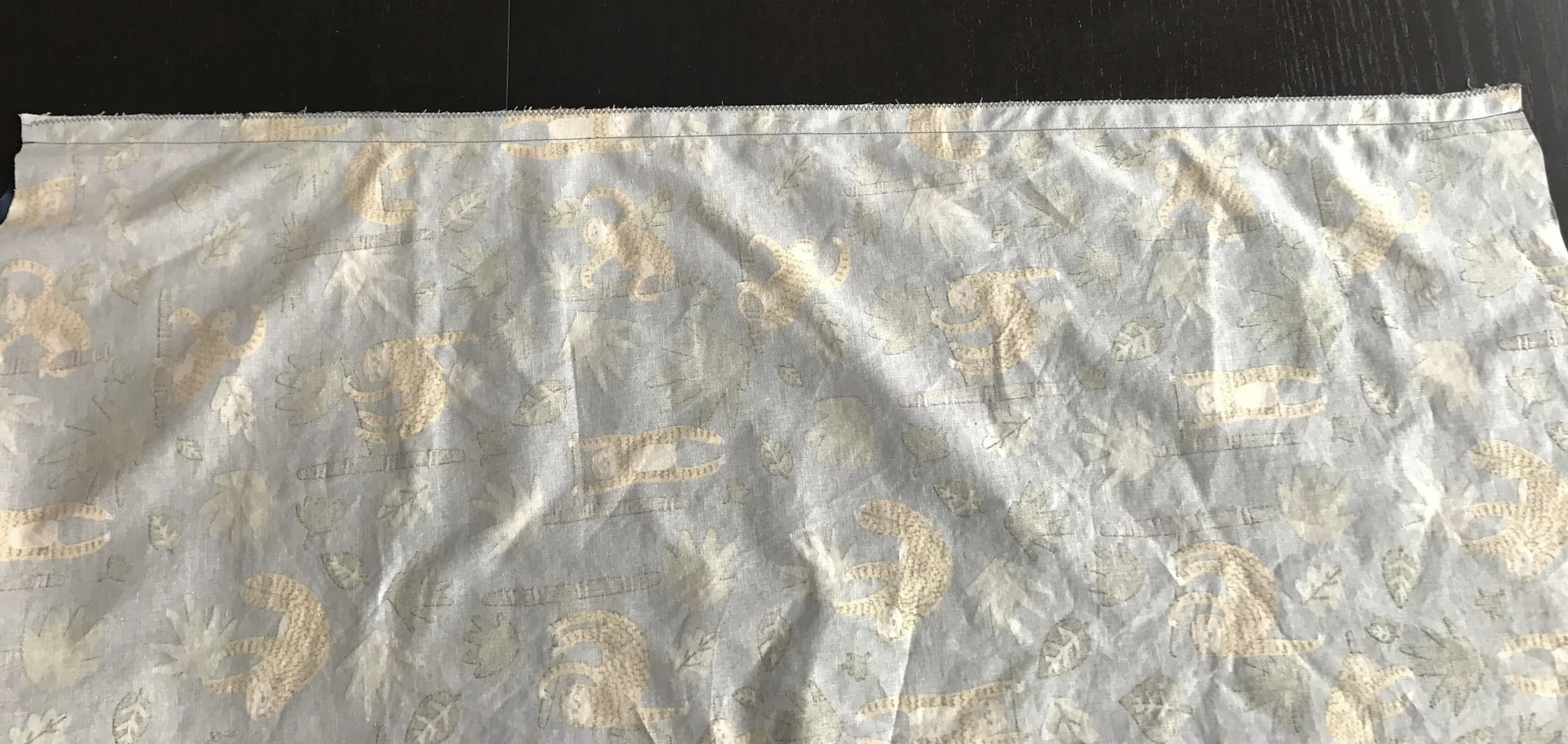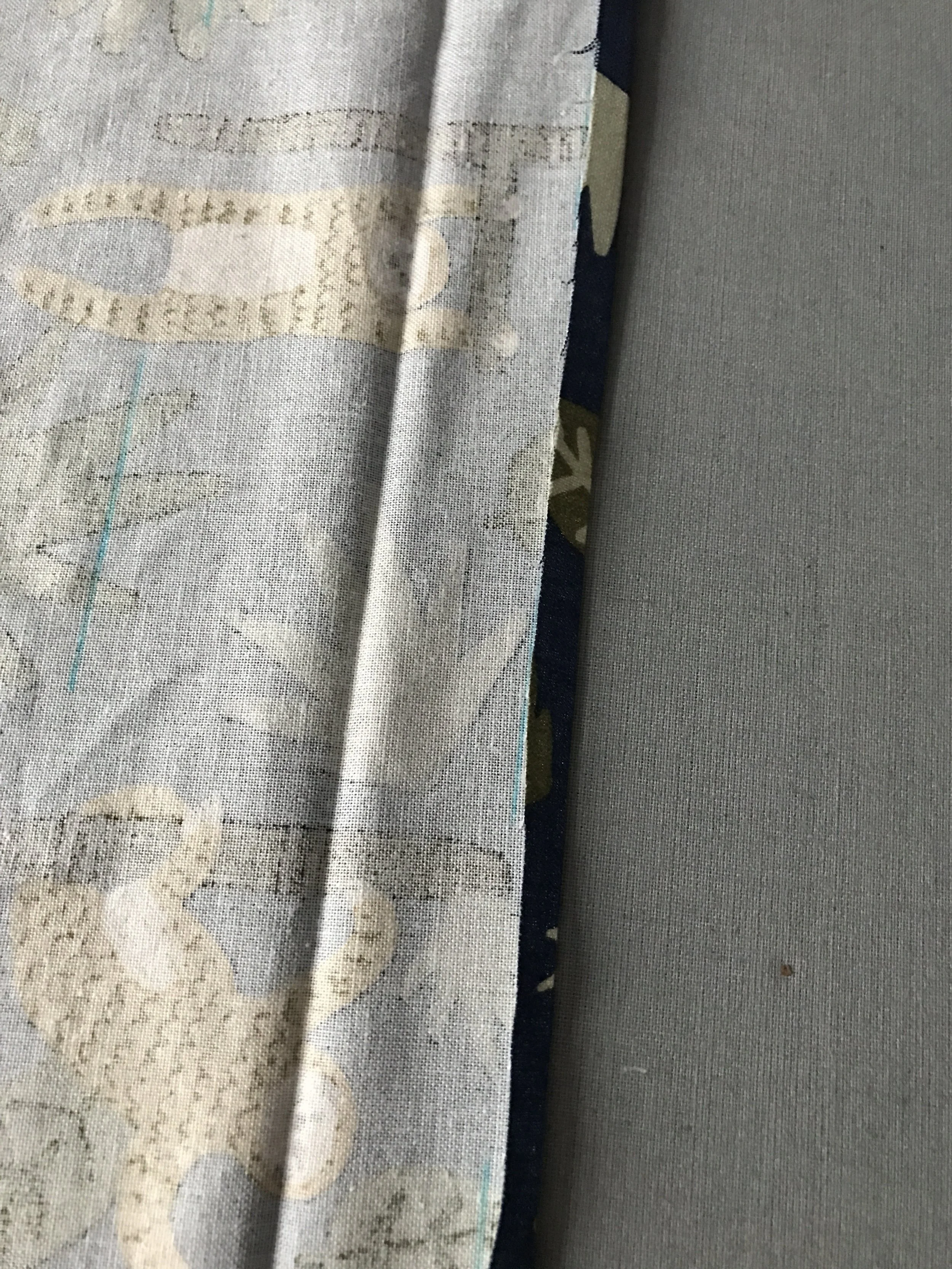 Nun falten wir wieder den Stoff bis zur Markierung und bügeln ihn mit viel Dampf fest. An dieser Stelle ist das etwas fummelig. Passt auf, dass Ihr euch nicht am Bügeleisen oder mit heißem Dampf verbrennt. Am Ende sollte es jedenfalls so aussehen: