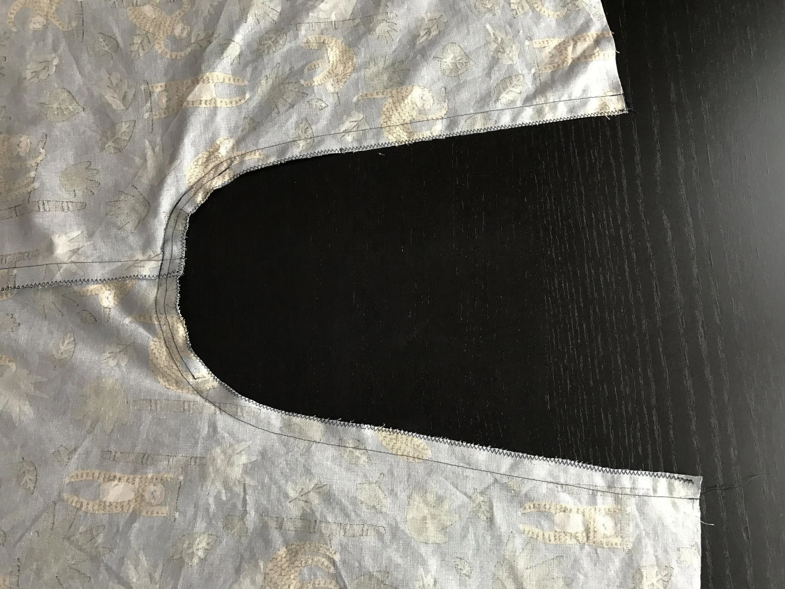Als nächstes müssen wir wieder die Nahtzugabe zur Seite bügeln. Zu welcher Seite ist dabei egal. An dieser Stelle ist das Bügeln etwas schwierig. Macht es aber trotzdem und achtet darauf, dass ihr die Nahtzugabe jeweils zur gleichen Seite bügelt und sich diese nicht verdreht. Wenn ihr das geschafft habt, müssen wir noch die beiden Seitennähte schließen. Also wieder: rechts auf rechts legen, so dass die Markierungs-Knipse sich treffen, stecken, nähen versäubern und dann die Nahtzugaben auf beiden Seiten zur Rückseite hin bügeln.