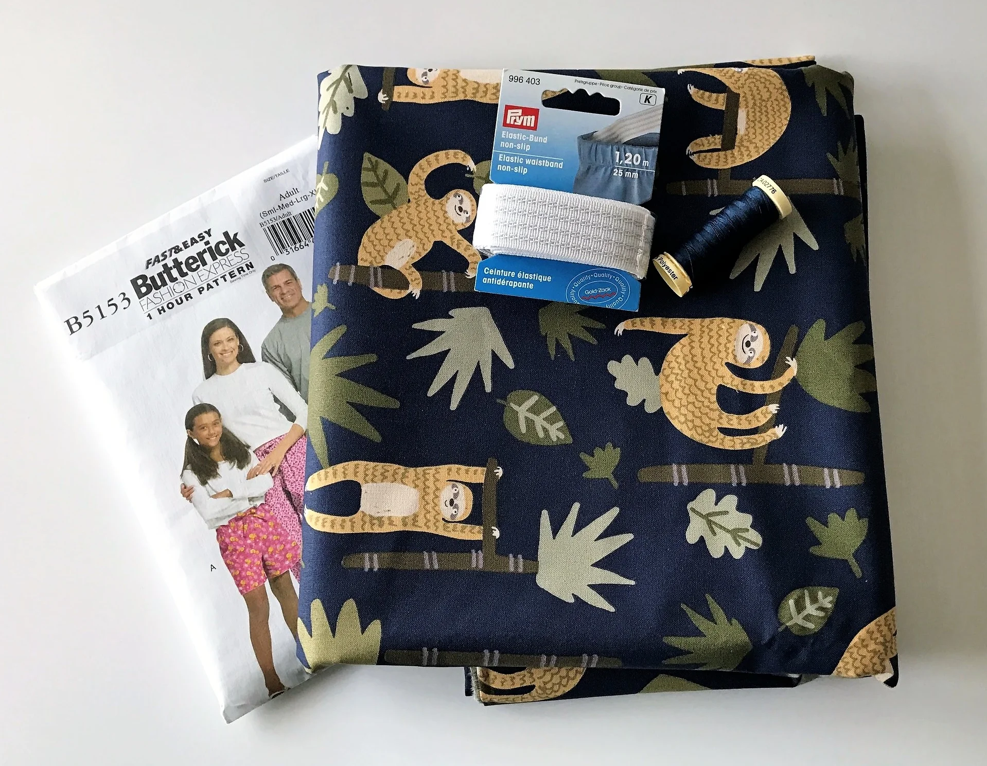 Ein Schnittmuster (ich verwende Butterick B5153) , einen gewebten Baumwollstoff (den sich mein Mann selbst ausgesucht hat ...), passendes Nähgarn und einen Elastic-Bund (25 mm breit; wichtig: "non-slip", damit das Gummi sich nachher im Bund nicht so leicht verdreht)