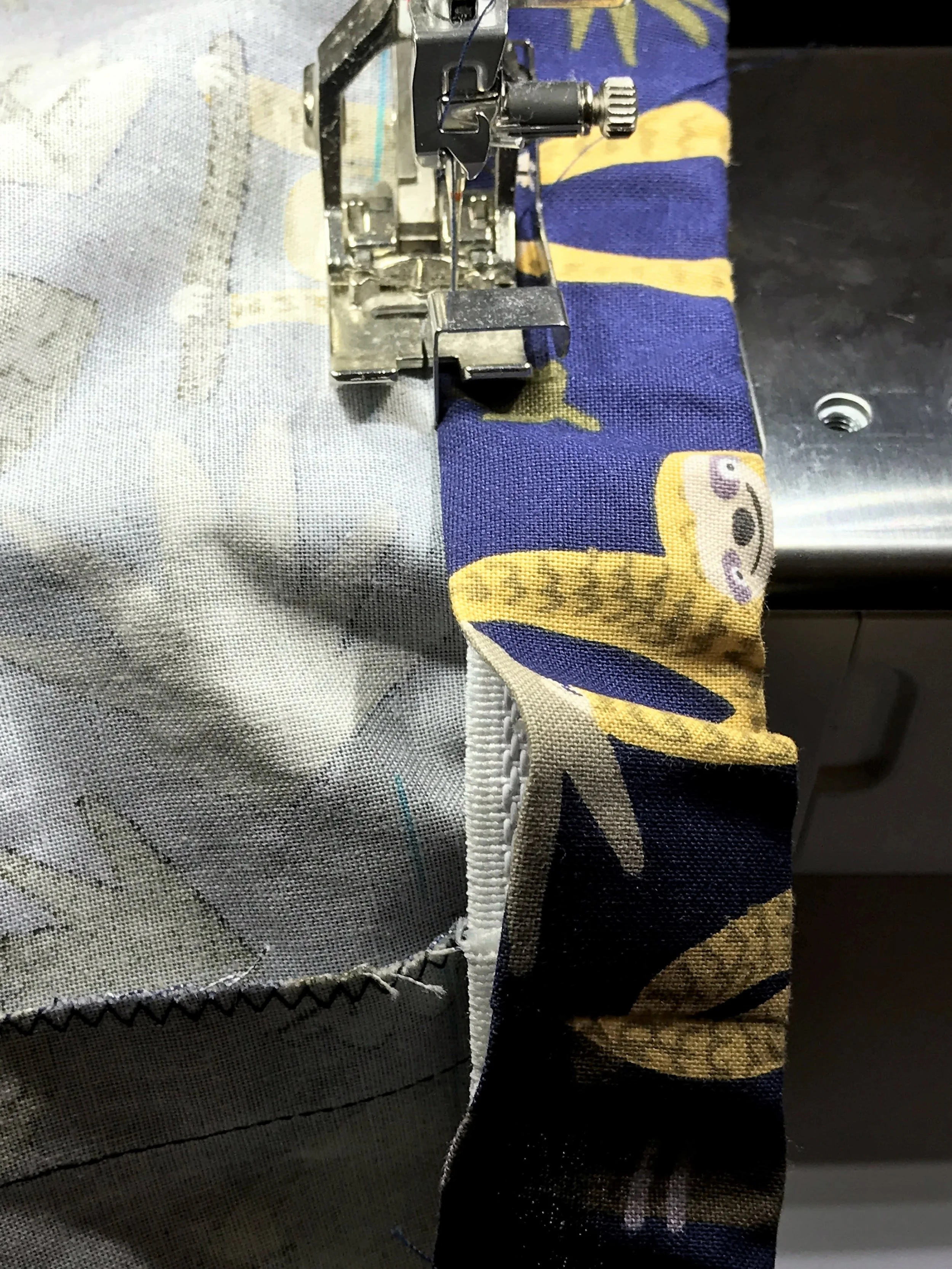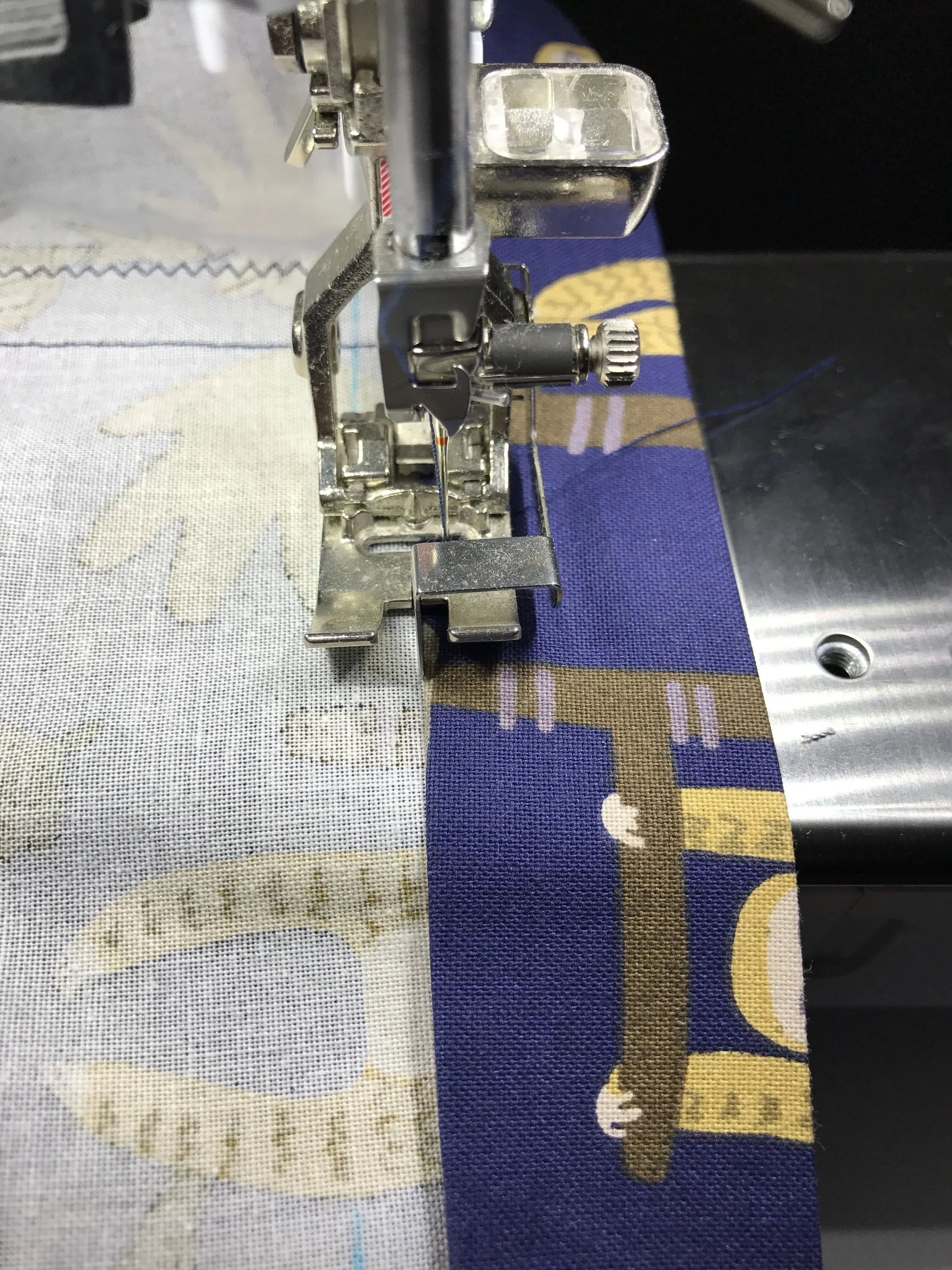 Als nächstes steppen wir die Kante am unteren Rand ab, etwa im Abstand von 2 bis 3 Millimetern. Ich verwende dazu einen meiner liebsten Nähfüße - einen Kantennähfuß mit Führungslineal. Wenn ihr die Kante absteppt, achtet darauf eine etwa 10 cm große Öffnung zu lassen - wir müssen ja später noch unseren Gummi einziehen. Wenn Ihr Euch unsicher seid, könnt Ihr auch rundherum Nadeln stecken. Ich war dieses Mal zu faul dafür und habe mir nur zwei Nadeln als Markierung für die Öffnung gesteckt.