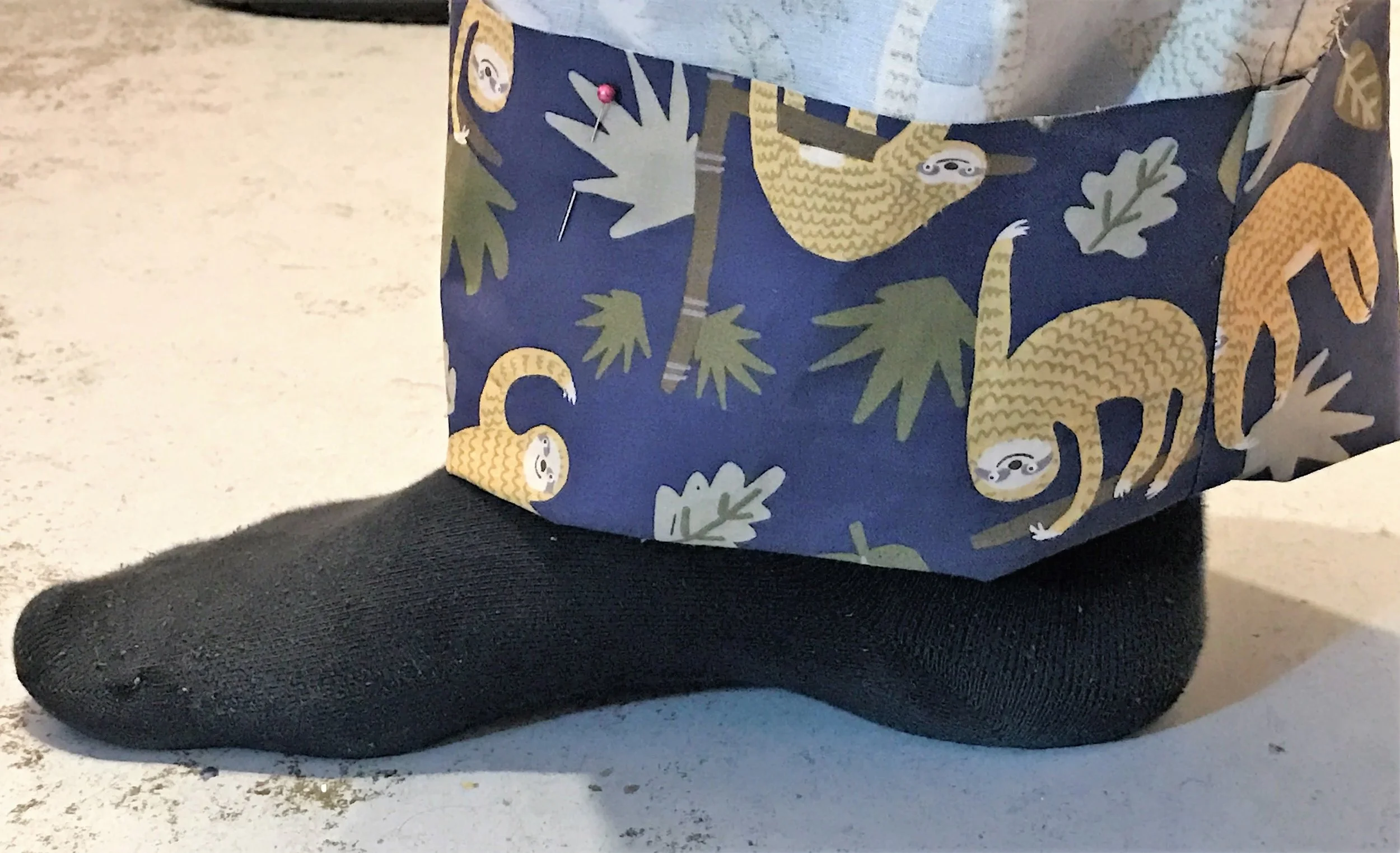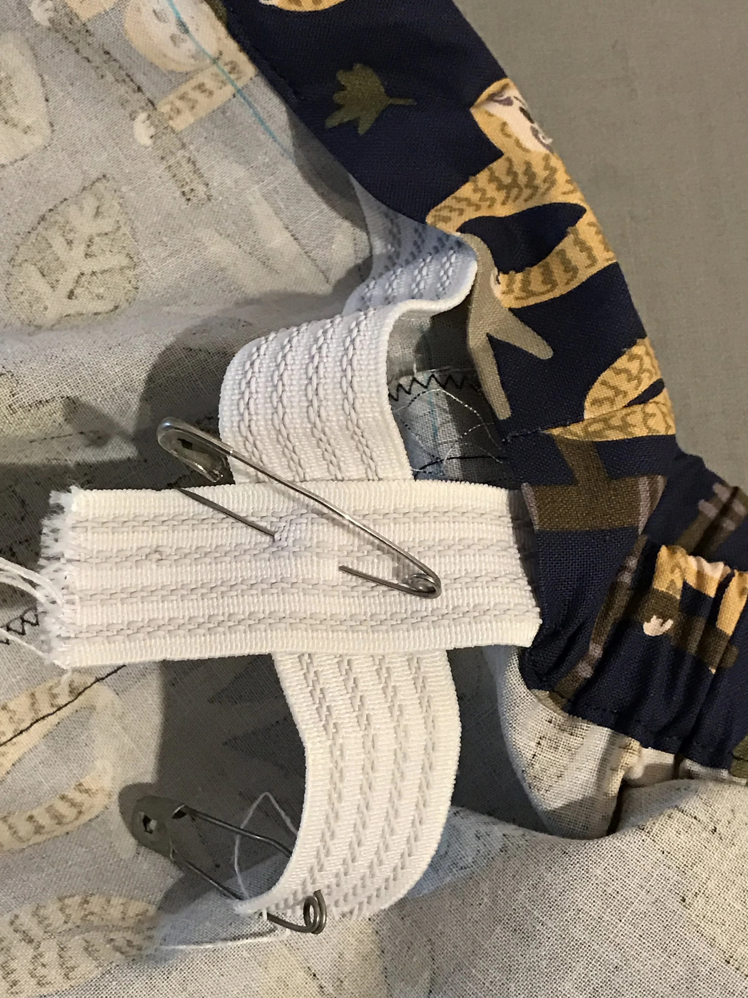 Nun kommt der Moment, die Hose anzuprobieren! Dabei könnt ihr sie auf links gedreht lassen. Überprüft nochmal, ob Euch die Weite es Gummis angenehm ist, oder ob Ihr sie vielleicht lieber etwas enger mögt. Steckt Euch die neue Abmessung mit der Sicherheitsnadel fest. Achtet darauf, dass beide Enden 1'' (2,5 cm) überlappen.