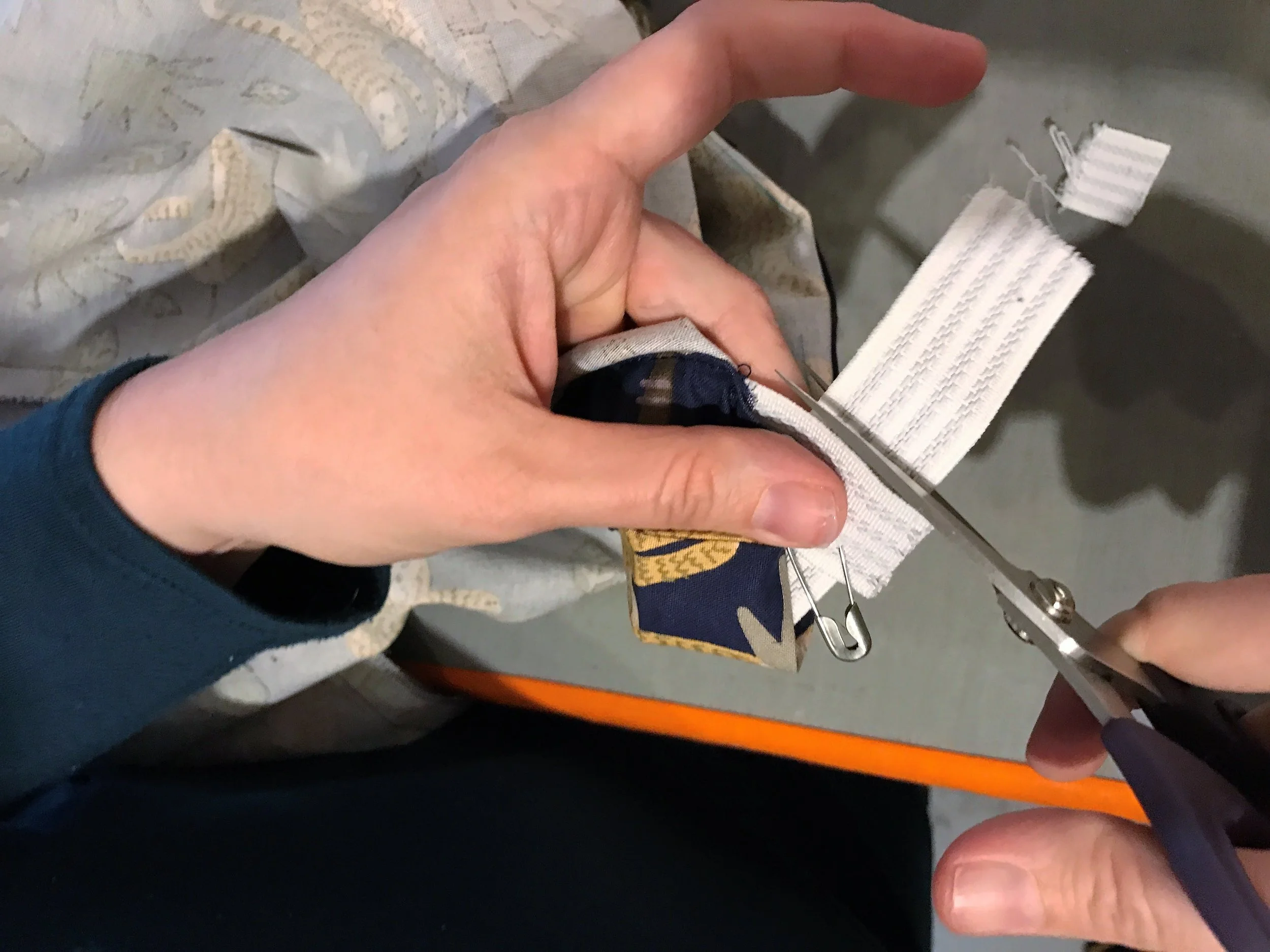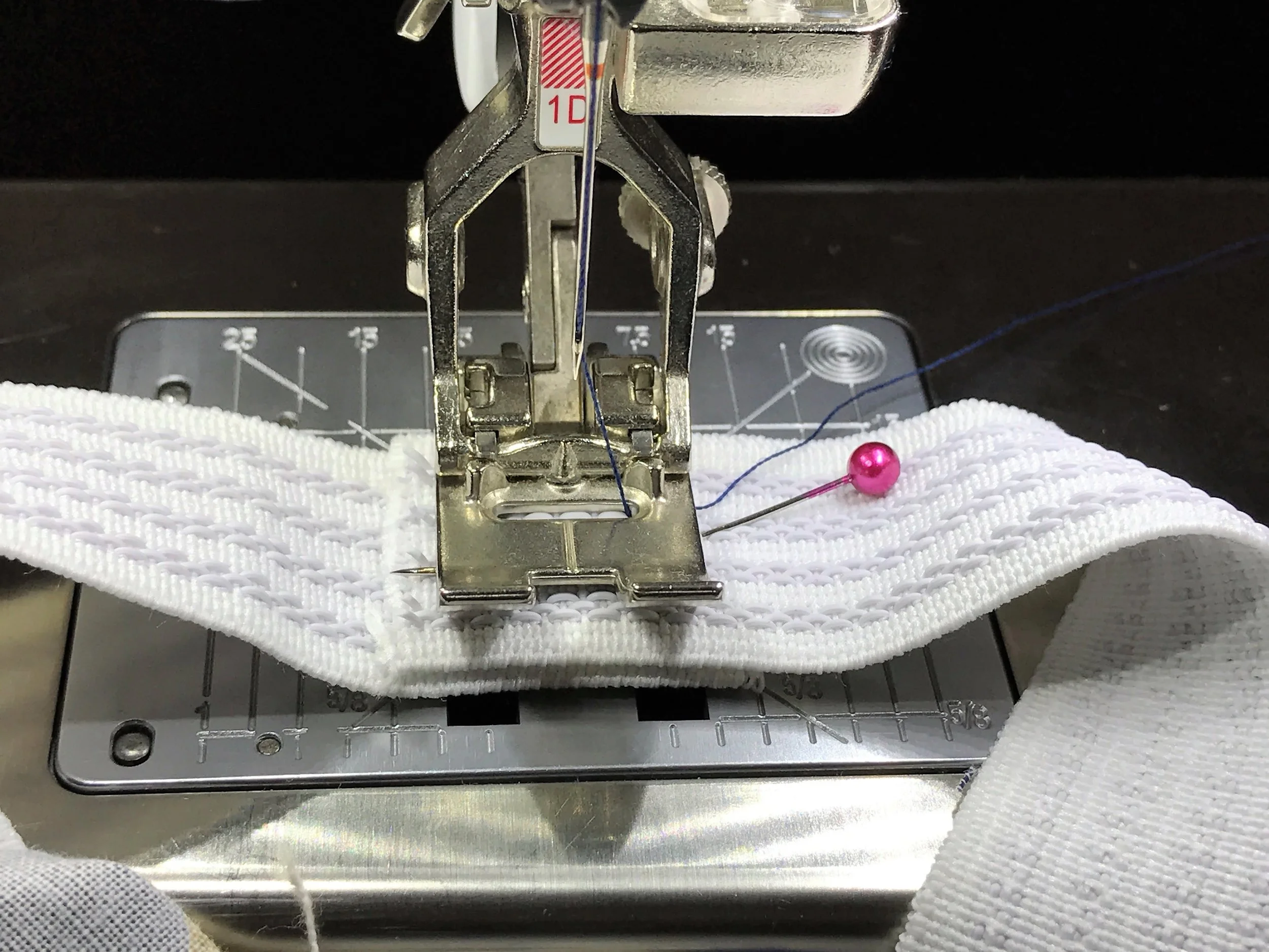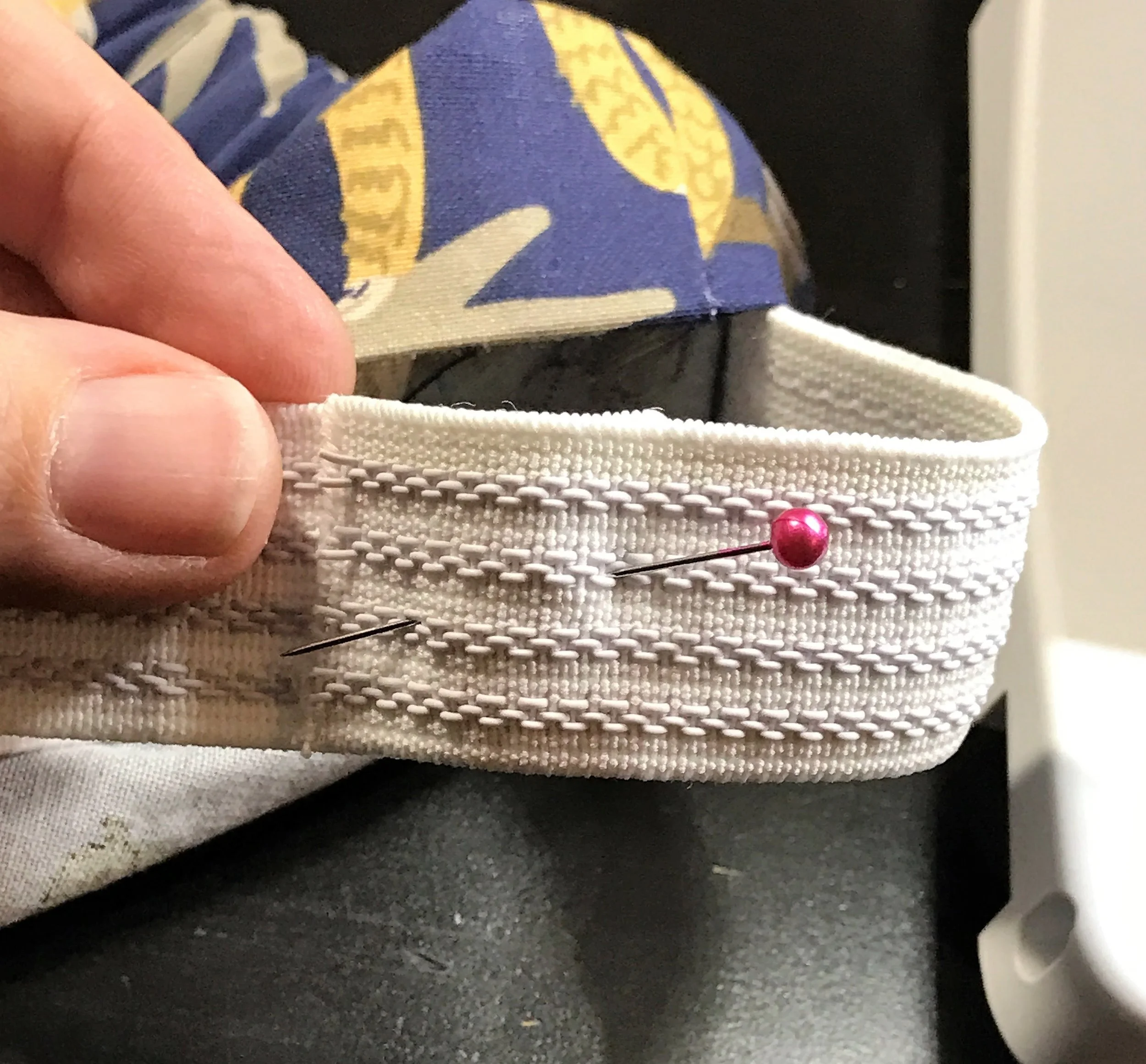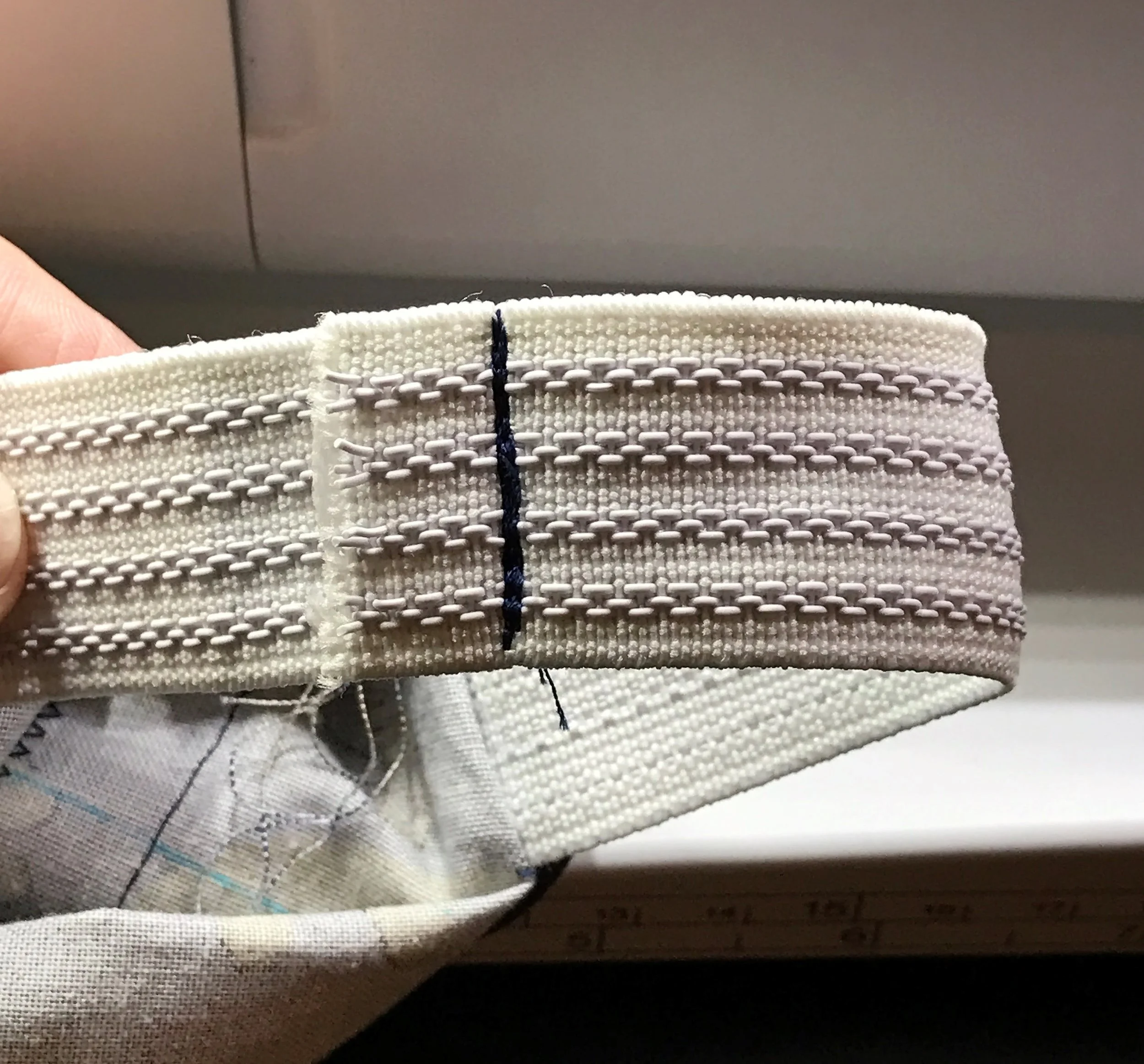 Bevor wir gleich die Enden zusammennähen, überprüfen wir, dass sich der Gummi im Tunnel nicht verdreht hat. Danach stecken wir die Enden mit 1'' (2,5 cm) Überlappung zusammen...