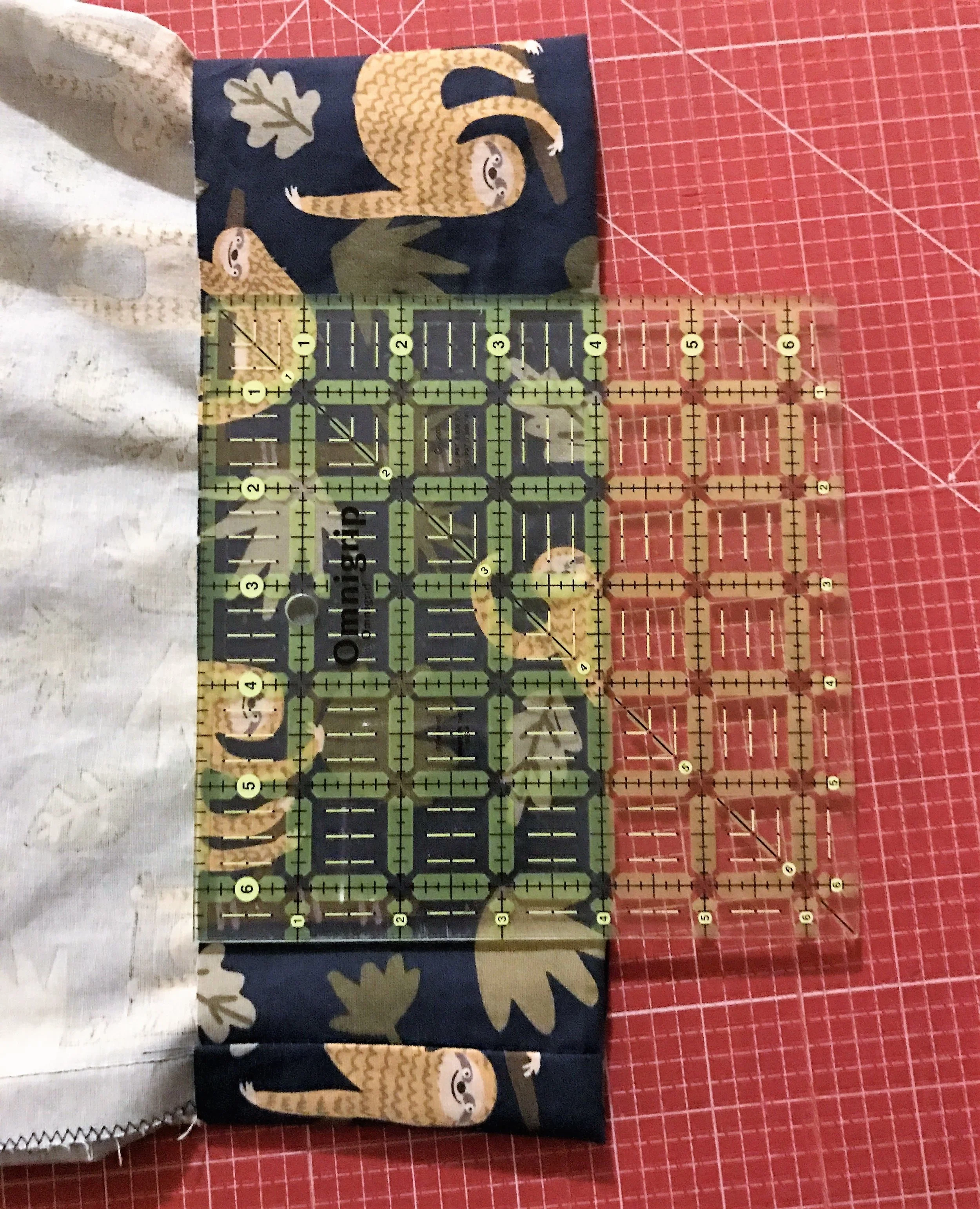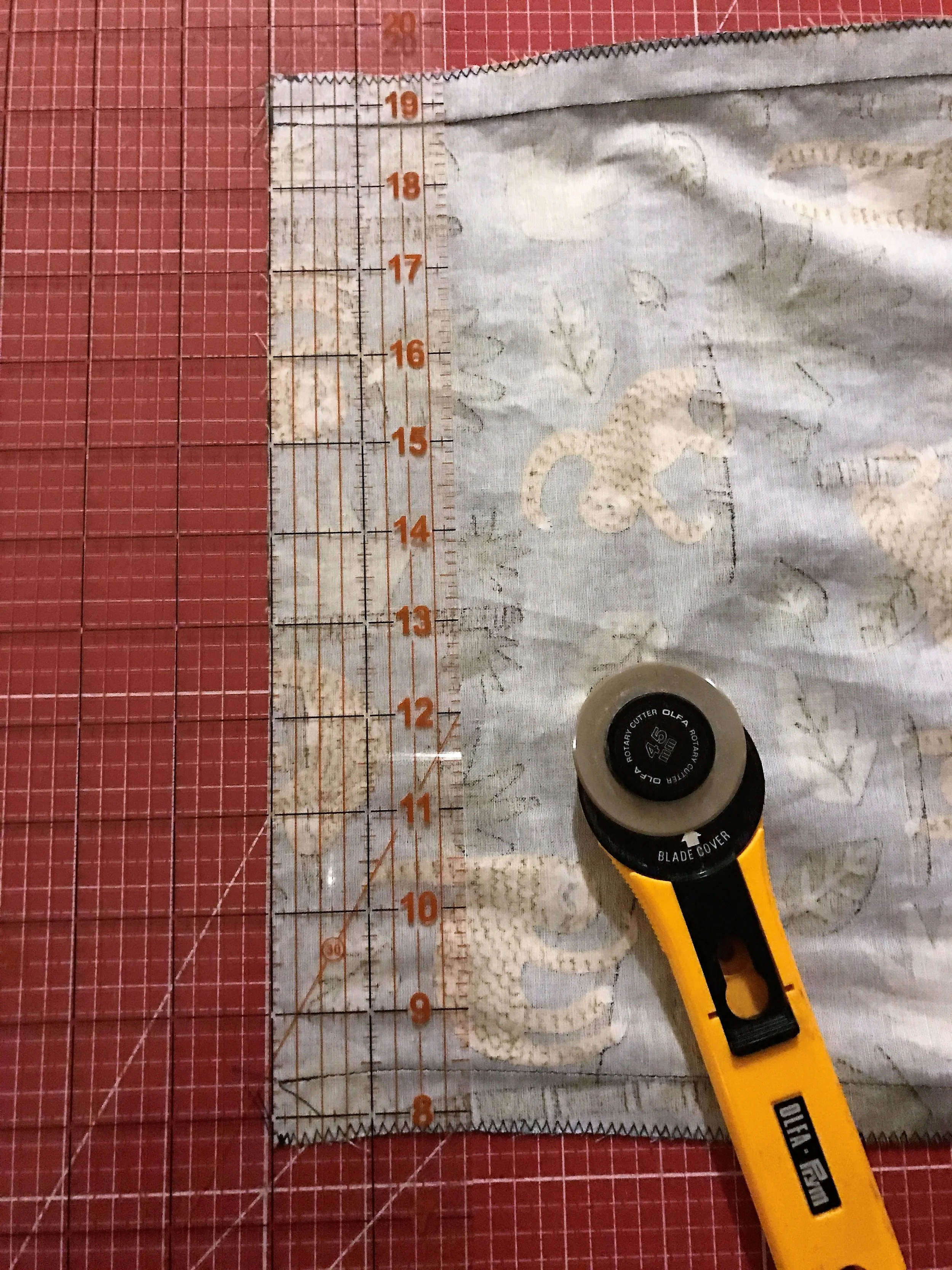 Ich verwende zum Kürzen mein Patchwork-Lineal und meinen Rollschneider und schneide bei beiden Beinen jeweils 2'' (5 cm) ab. Falls Ihr das nicht habt, könnt Ihr auch alternativ eine Linie in entsprechendem Abstand zur Stoffkante markieren und mit der Schere abschneiden.